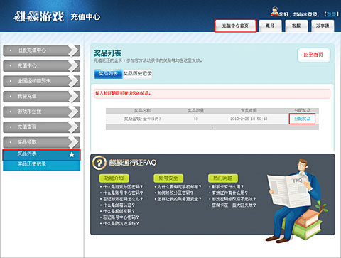 4、奖励领取流程:玩家回复正确的以上信息后,相应奖励将在4月18日10:00前发放至玩家帐号中心,届时请玩家进入充值中心点击左侧『奖品列表』按钮,可查看到您所获赠的奖励物品:“XX两金卡”。点击『分配奖品』按钮,选择所要分配的游戏大区,输入验证码,点击『确定』按钮,即分配成功。