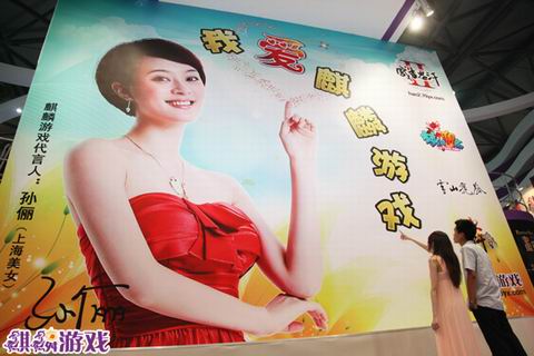 今天是2010年ChinaJoy开幕后的第一天,同时也是专业媒体接待日。走进拥有众多北京厂商汇聚的W2号馆后,最吸引人眼球的莫过于“麒麟游戏”的游戏展台中那副用正面墙壁喷绘而成的孙俪巨型海报。除了孙俪的那明媚笑容以外,“我爱麒麟游戏”的宣传标语也相当惹眼。